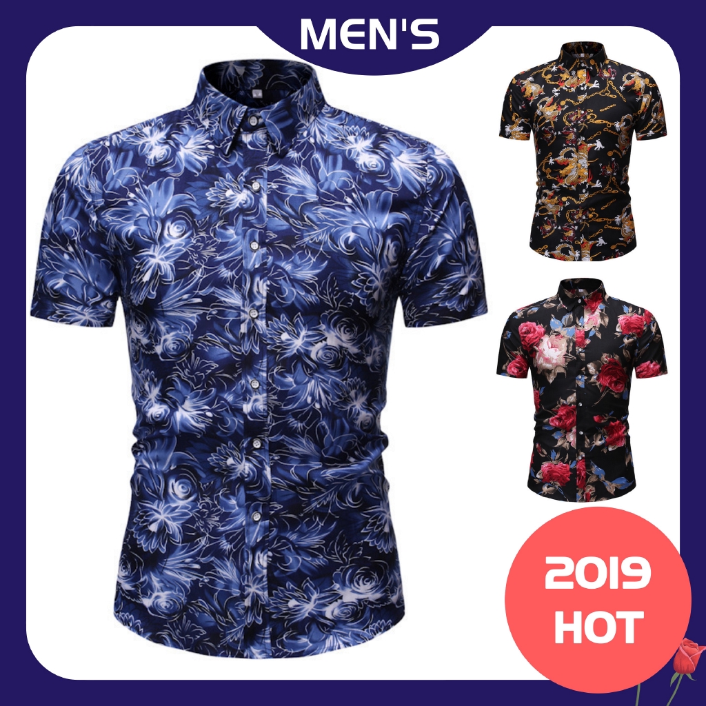 Hot15 Colors Men S Shirt Short Sleeve Men Kemeja Batik Floral Print Lelaki Baju Slim Fit Casual Men Shirts Shopee Malaysia