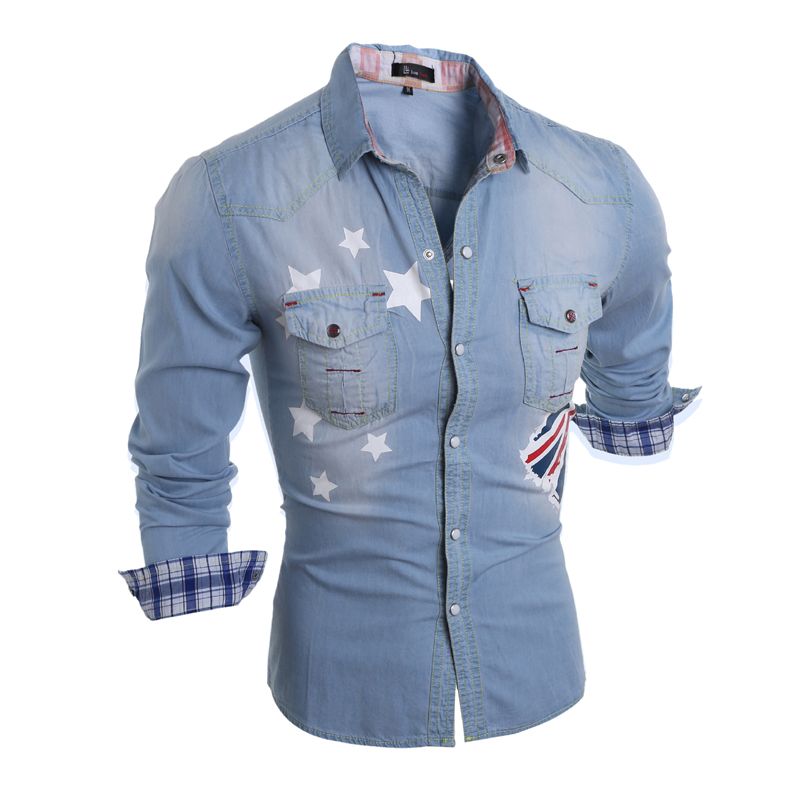 Satin Al 2016 Yeni Moda Erkekler Denim Gomlek Uzun Kollu Yildiz Bayrak Baski Tasarim Slim Fit Gomlek Isik Ve Koyu Mavi Renkler Kot Gomlek Tl146 28 Tr Dhgate Com