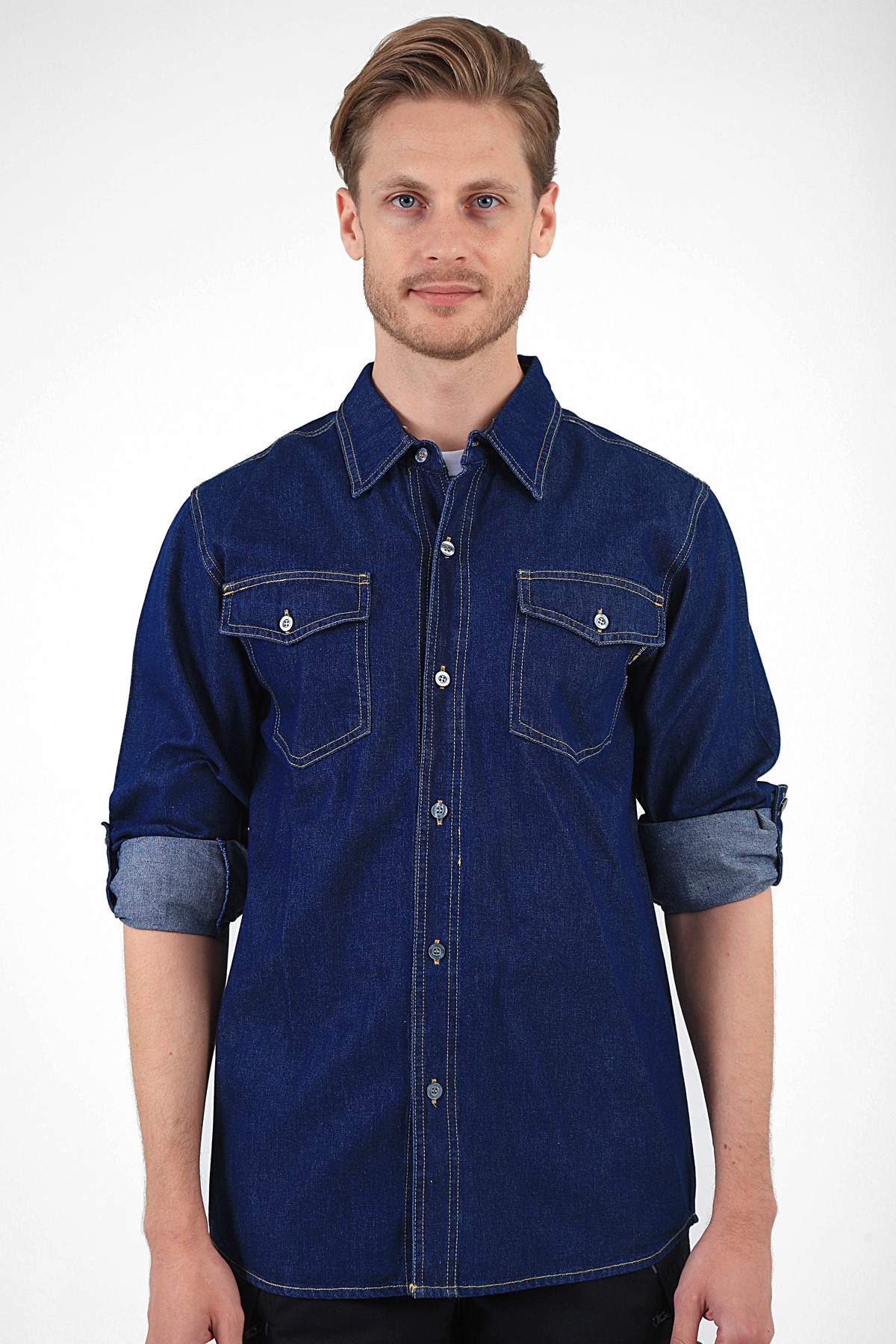 Mavi Renk Taslamali Cift Cep Erkek Kot Gomlek Pobudo Com