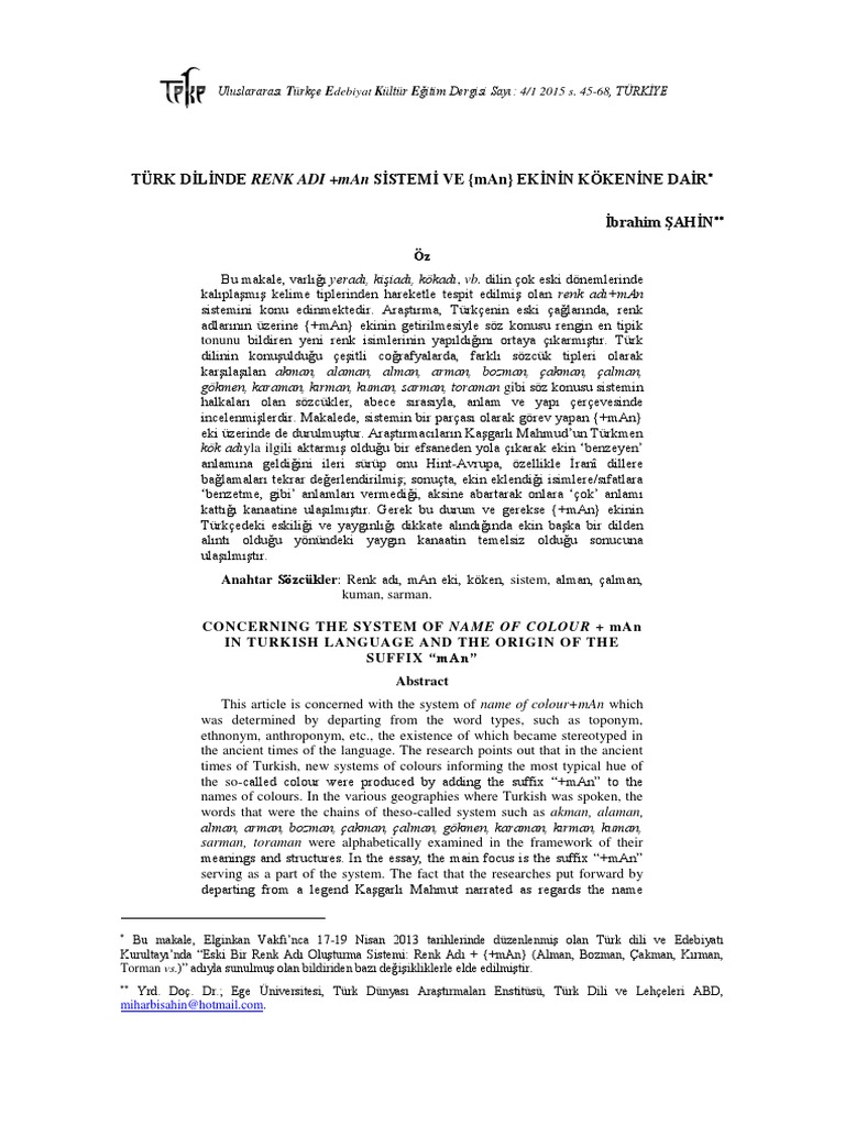 Turk Dilinde Renk Adi Sistemi Ve Man Ekinin Kokenine Dair Pdf